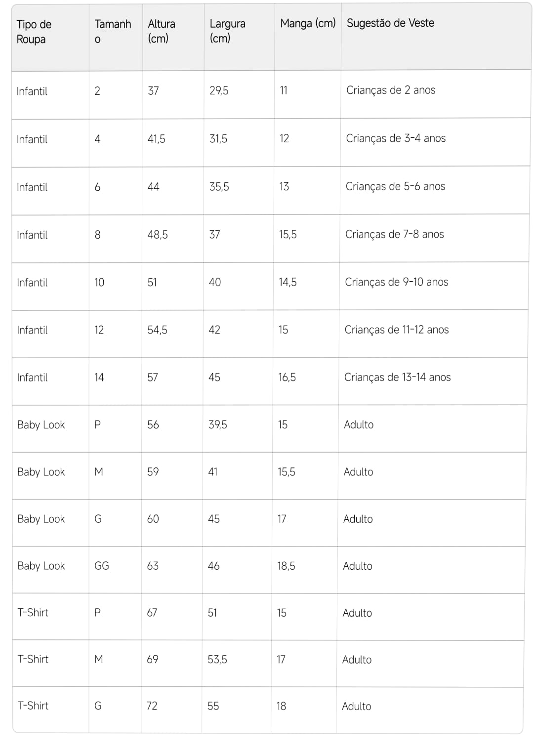 - Como Medir: Use uma fita métrica e compare com uma peça sua que vista bem.